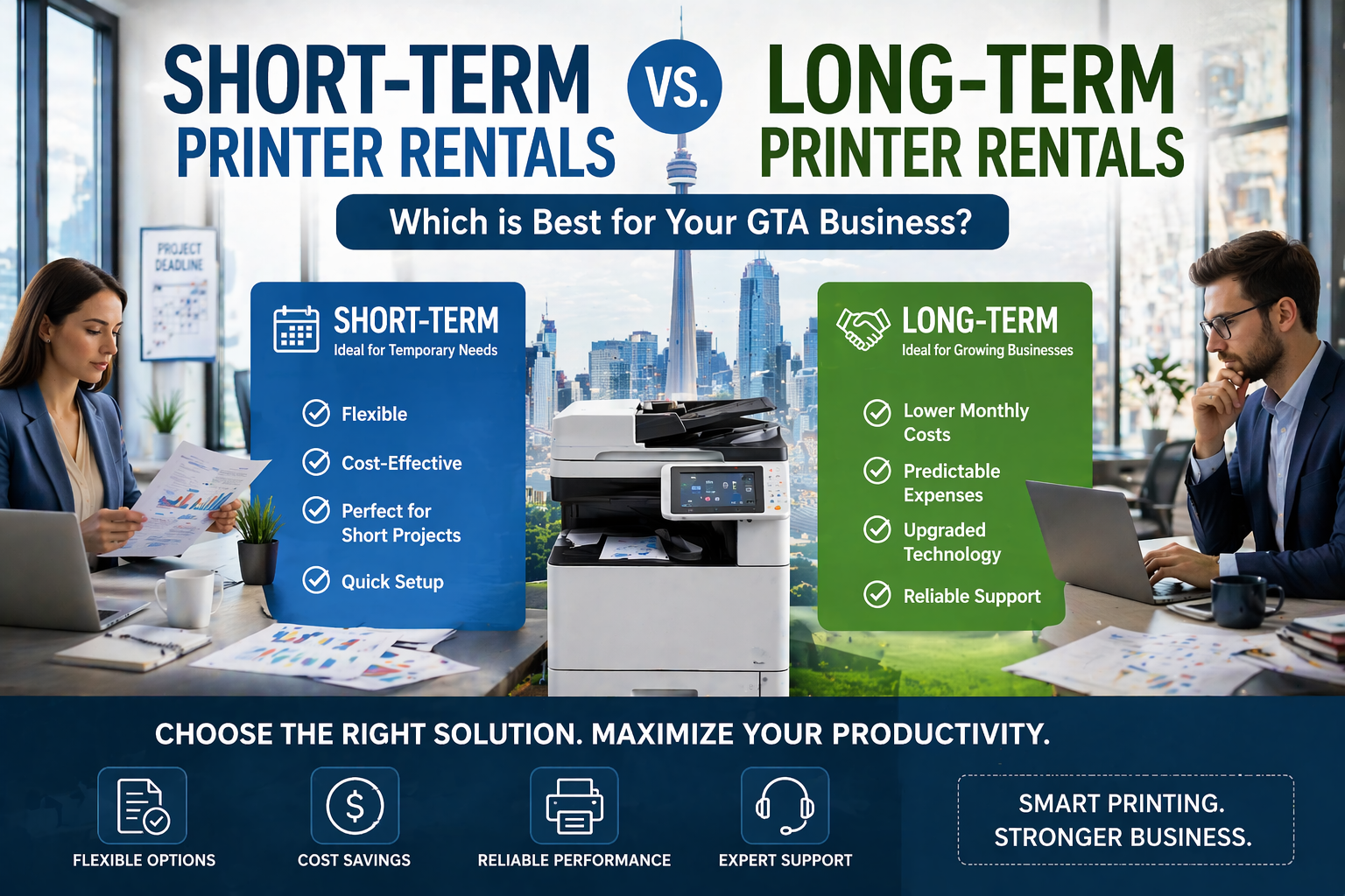 The Service Level Agreement (SLA) is the most important thing, no matter if you choose a short-term or long-term path. When a printer breaks down in a busy GTA office, work stops completely.